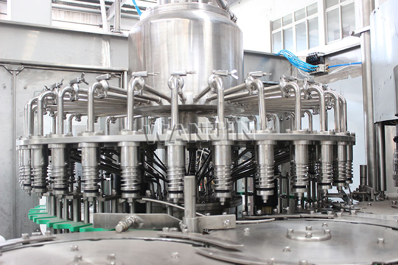 La parte de llenado se compone principalmente de un barril de embotellado, una válvula de embotellado, un riel de guía, un dispositivo de elevación, un dispositivo elevador de sujeción de botellas, etc.
